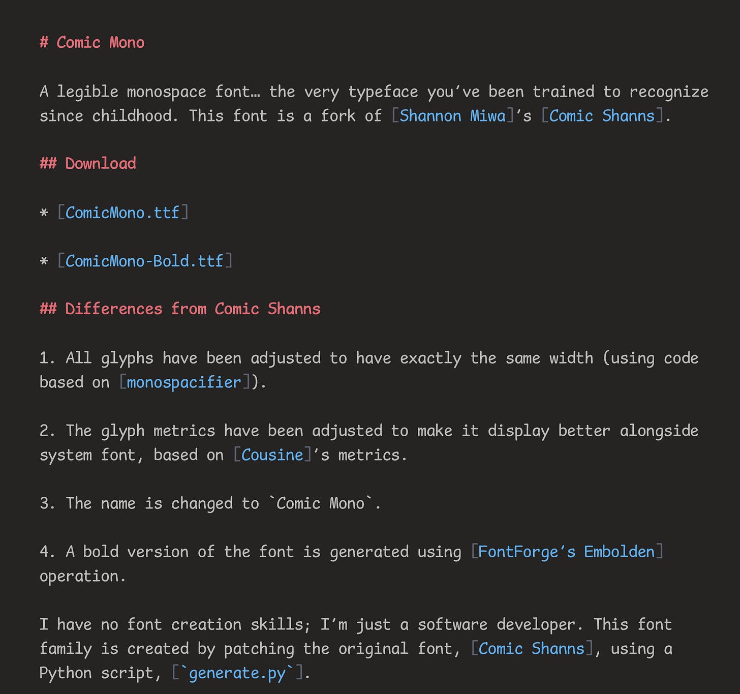 Comic Sans 作為一款惡名昭彰的字體(笑),一直以來還是有不少擁戴者和粉絲。今天要介紹給大家的這款 Comic Mono,是以 Comic Sans 為基底改良的等寬字體。改成等寬字後附加了一個好的副作用:修好了怪異的字間距。