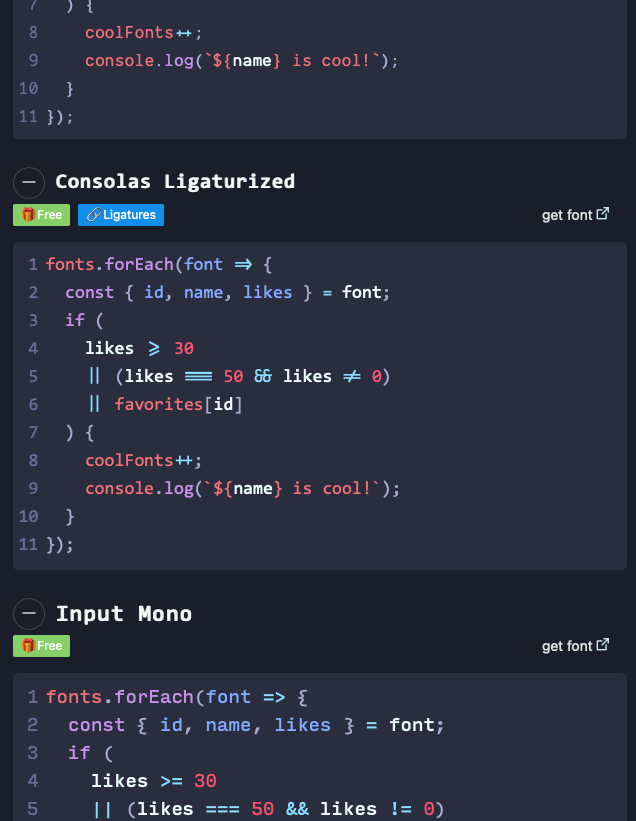 這幾年許多軟體公司紛紛的都推出了適合撰寫程式用的字型,一時讓人目不暇給。所幸,有人製作了這個網站,讓你在決定下載安裝到電腦前,可以先在接近自己開發環境的配置下先比較看看。